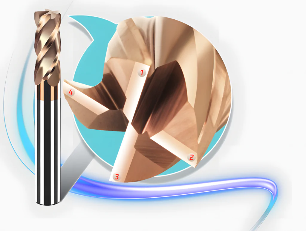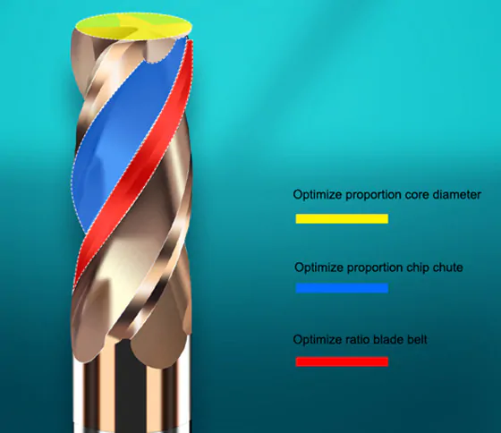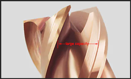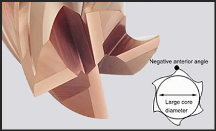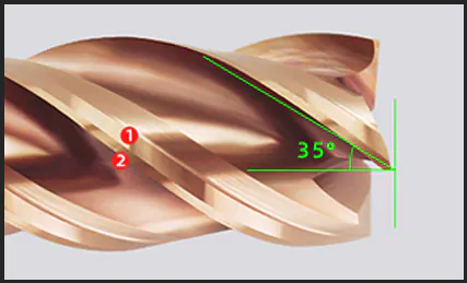 DUPLO FILHETE DE CORTE COM ÂNGULO DE HELICE COM 35º TORNANDO A FRESA MAIS RESISTENTE AO DESGASTE COM CORTE SUAVE.