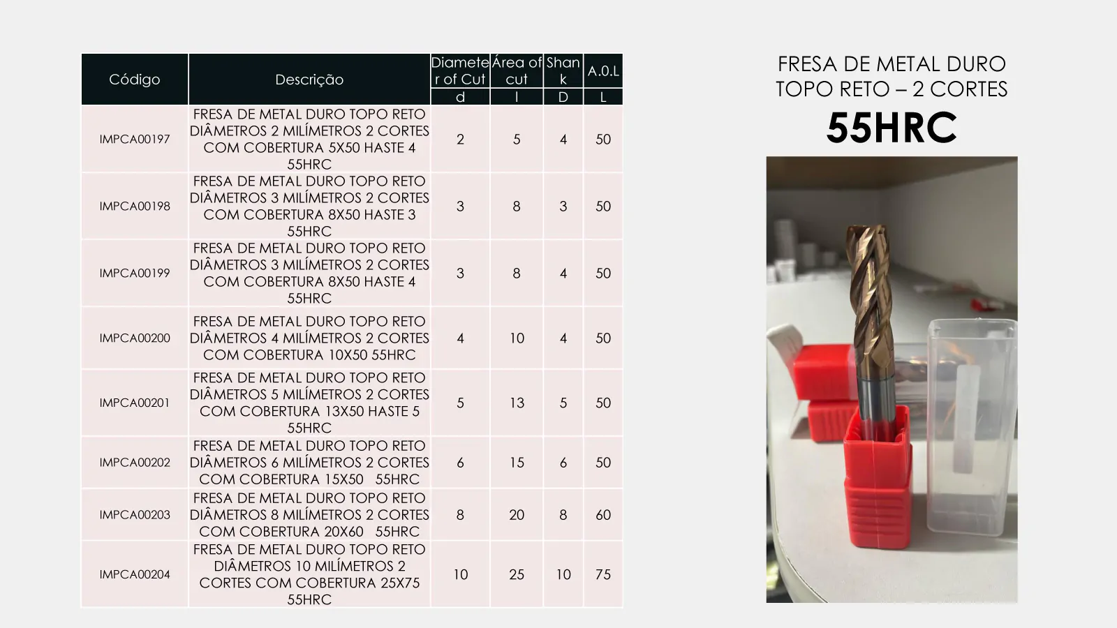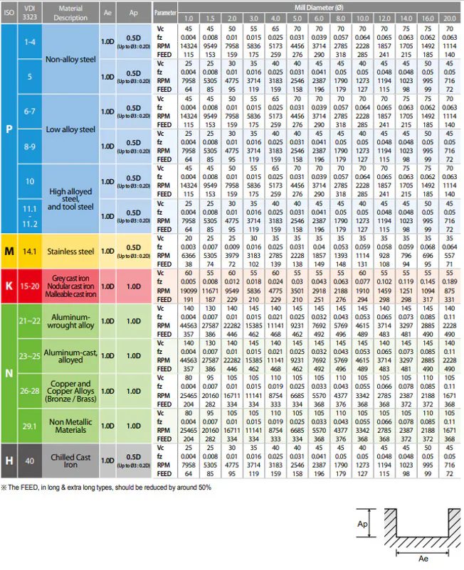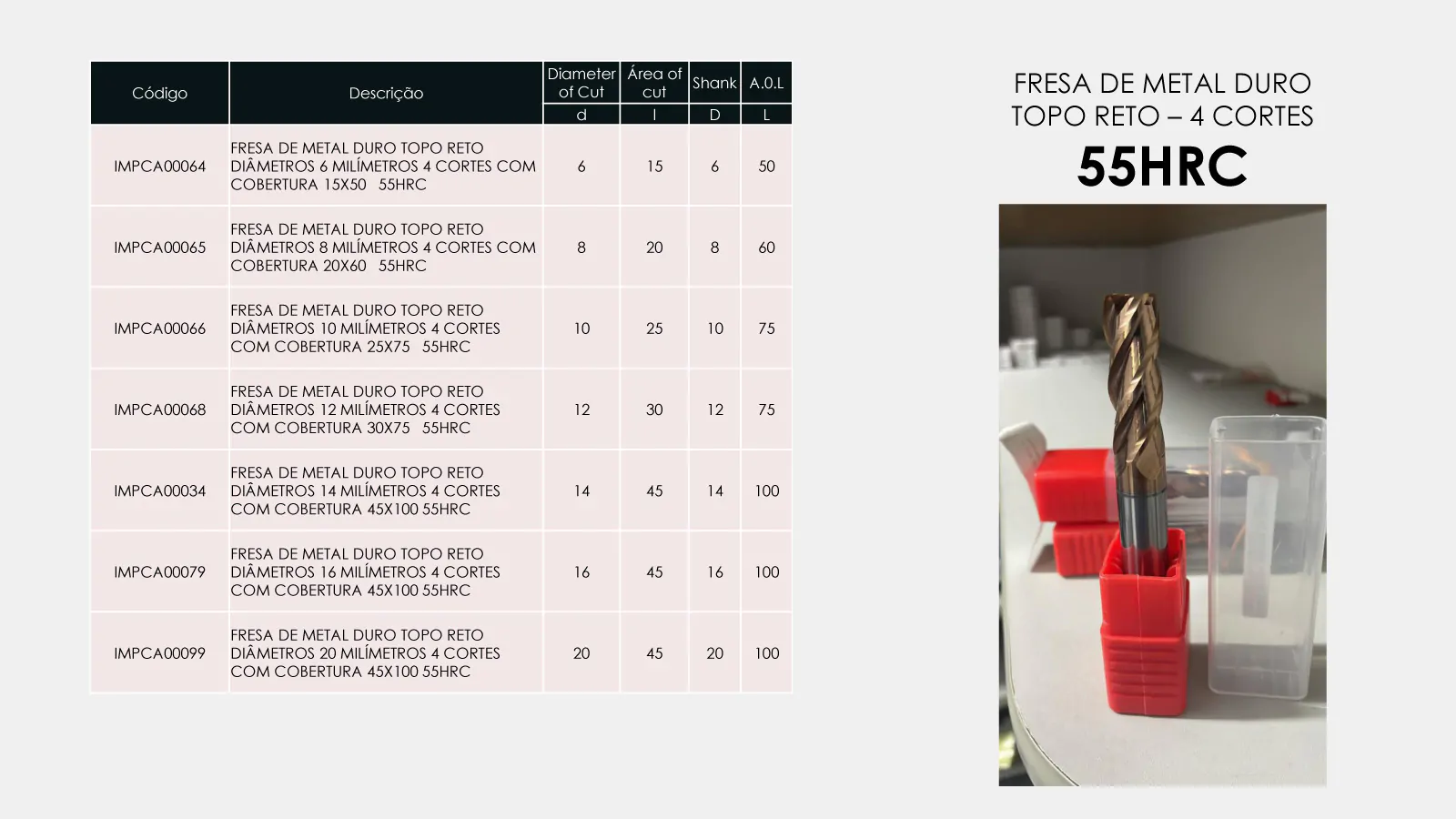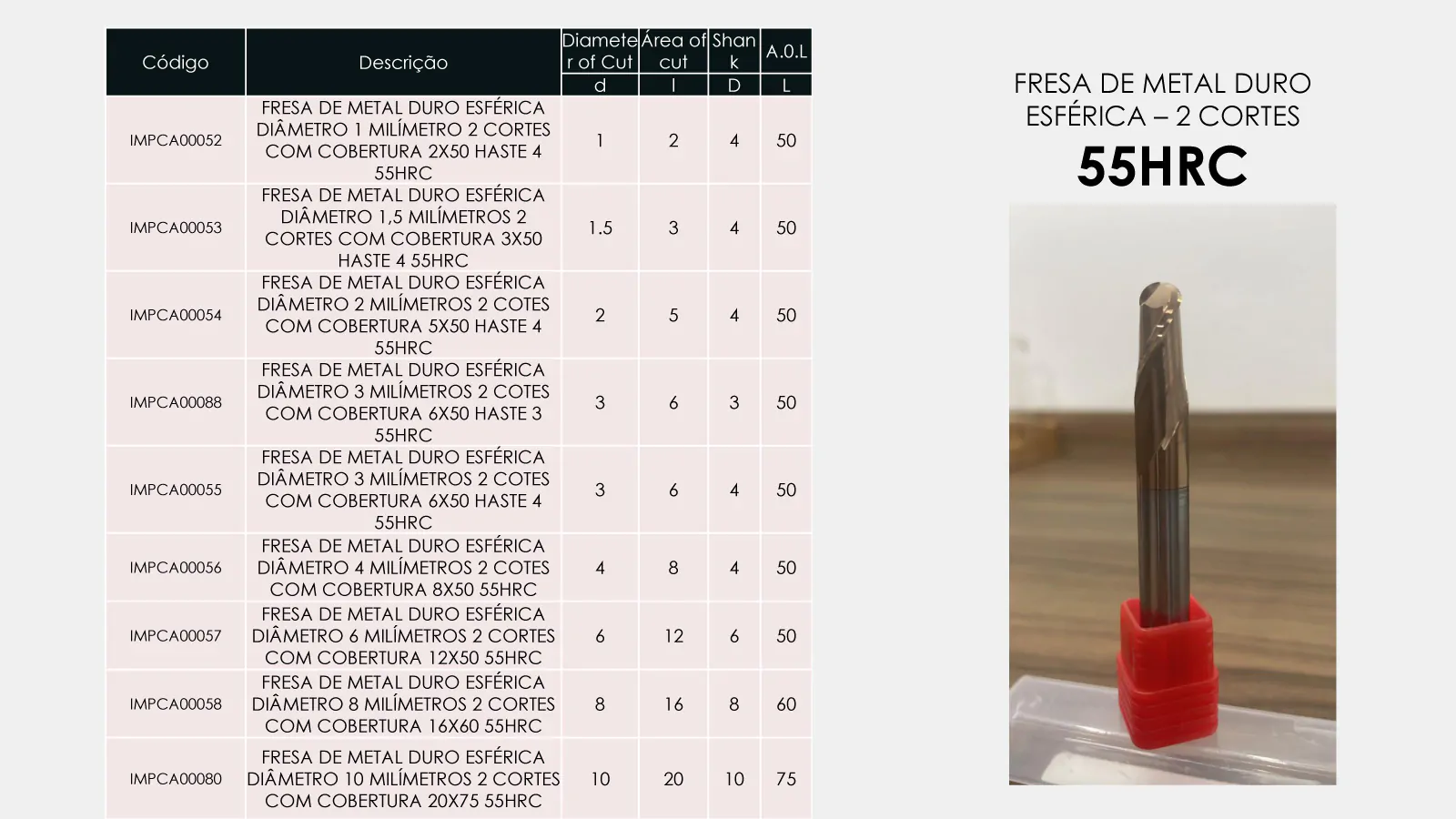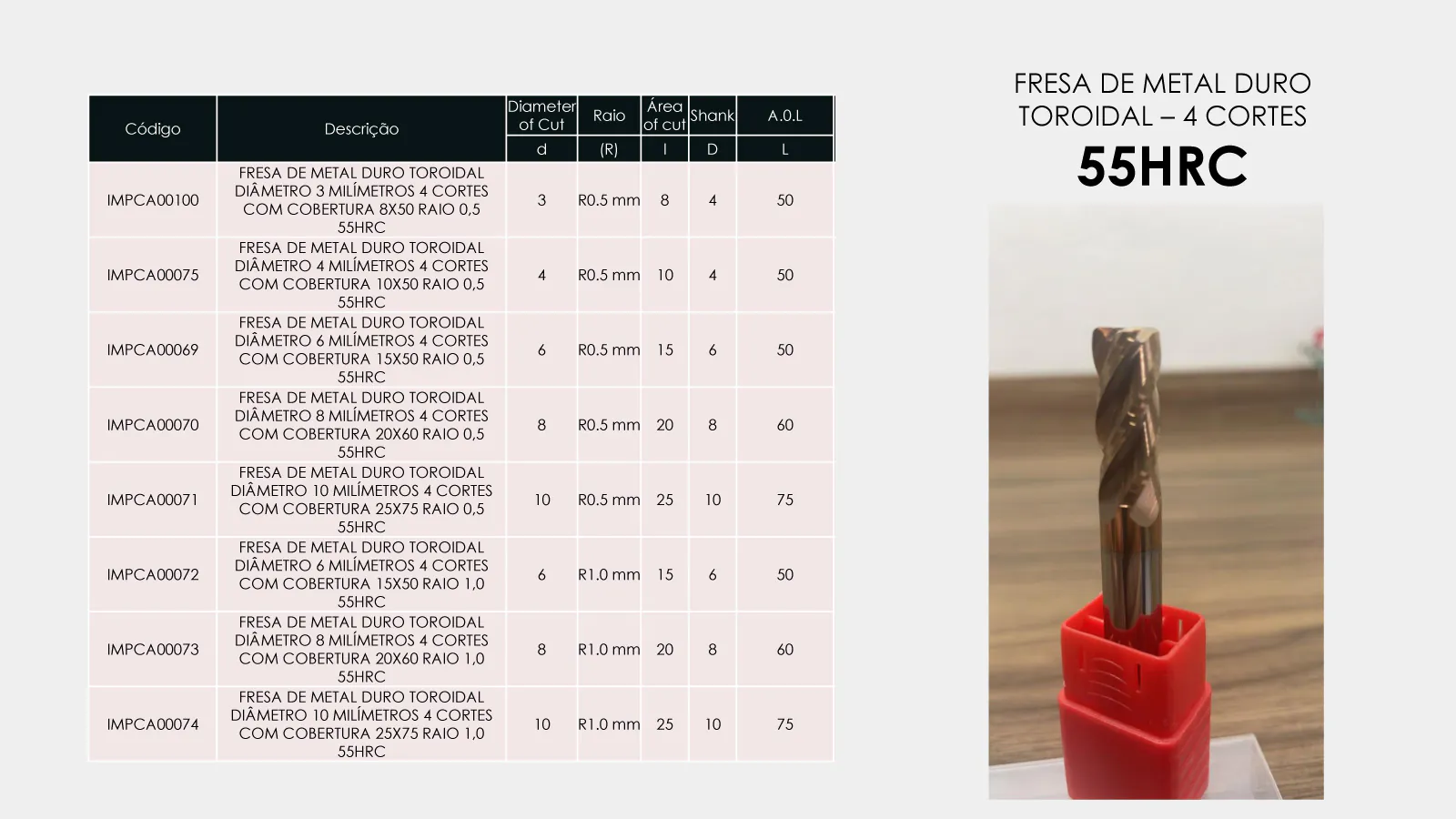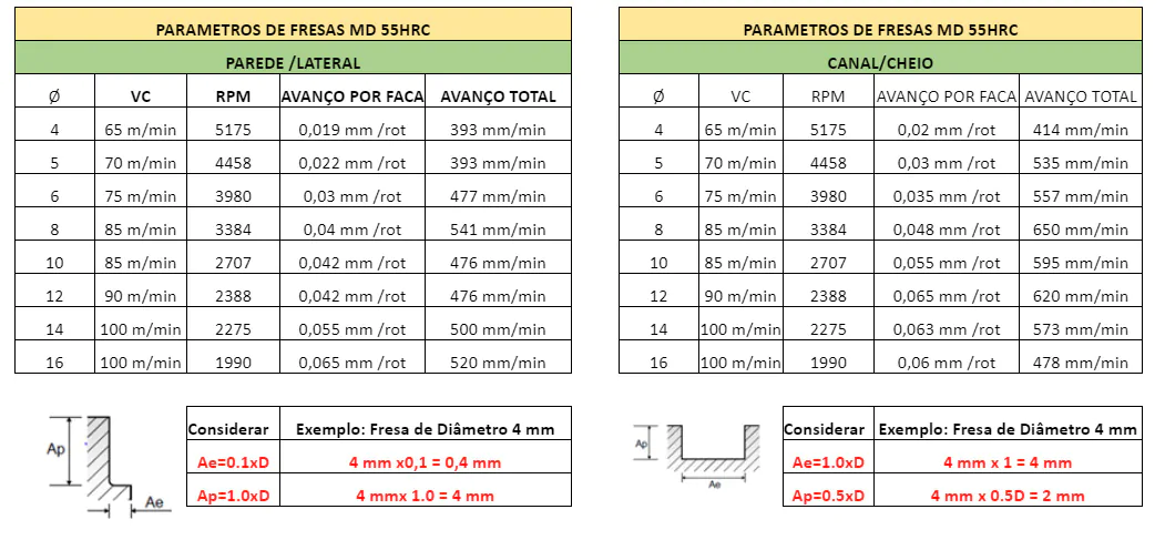 ESTA FRESA É INDICADA PARA USINAGEM EM DESBASTE, SEMI ACABAMENTO E ACABAMENTO, RECOMENDA-SE APLICAR EM MATERIAIS COM ATÉ DE 55 HRC DE DUREZA.